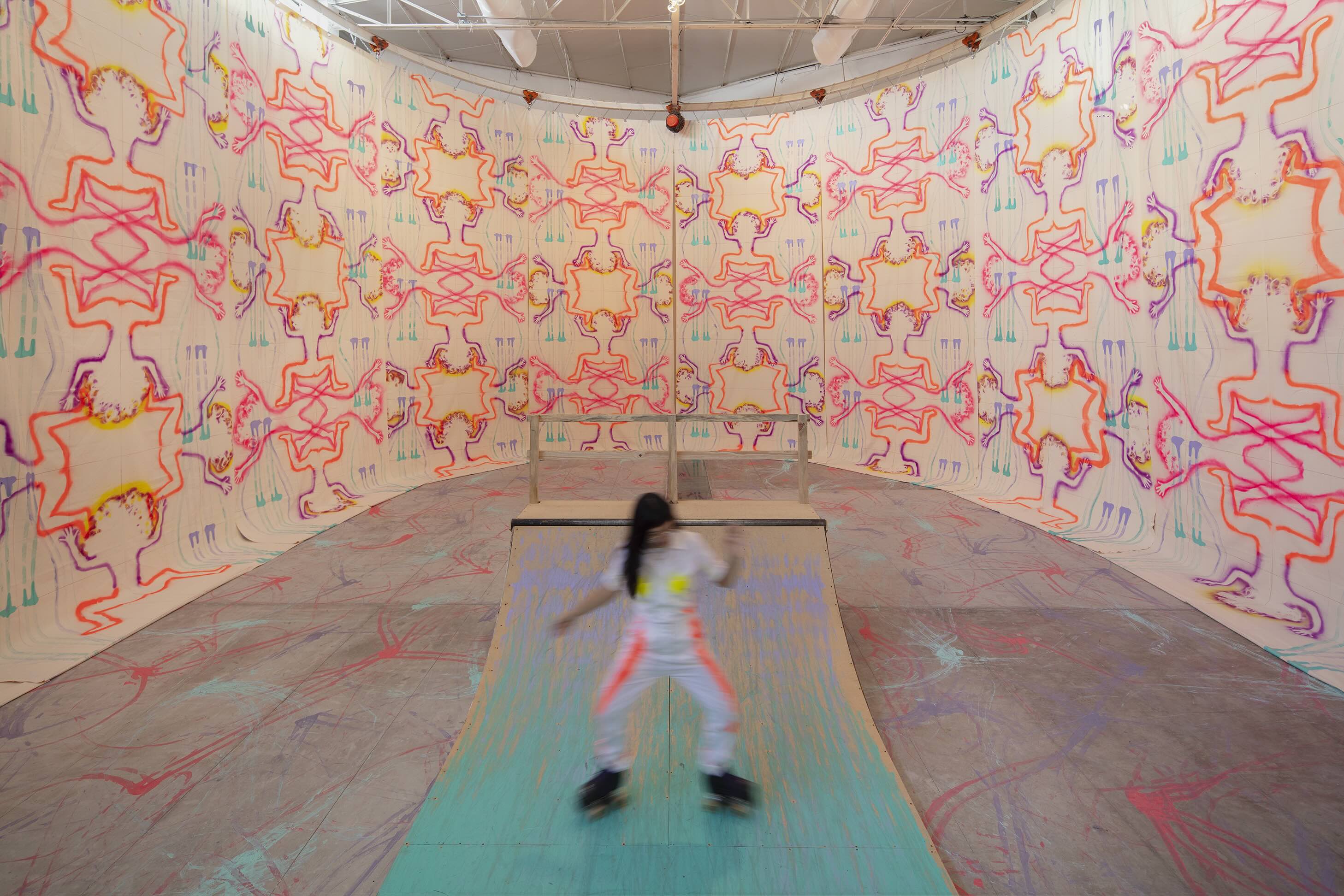 El resultado es un conjunto de telones en gran formato que guardan la huella del movimiento, tanto de los patines como de las siluetas de las patinadoras en distintas posiciones, cual pinturas rupestres. ¿Será que darle al cuerpo femenino en movimiento un espacio activo en las salas de exhibición sigue siendo un gesto revolucionario? La instalación textil, además, está acompañada por una pista de patinaje como una insistencia por configurar otros modos de habitar y activar los espacios expositivos. Se presentan, también, una serie de proyecciones de video realizadas por Cristian Manzutto que da cuenta del proceso de creación de la obra mural que se extiende hacia el piso.