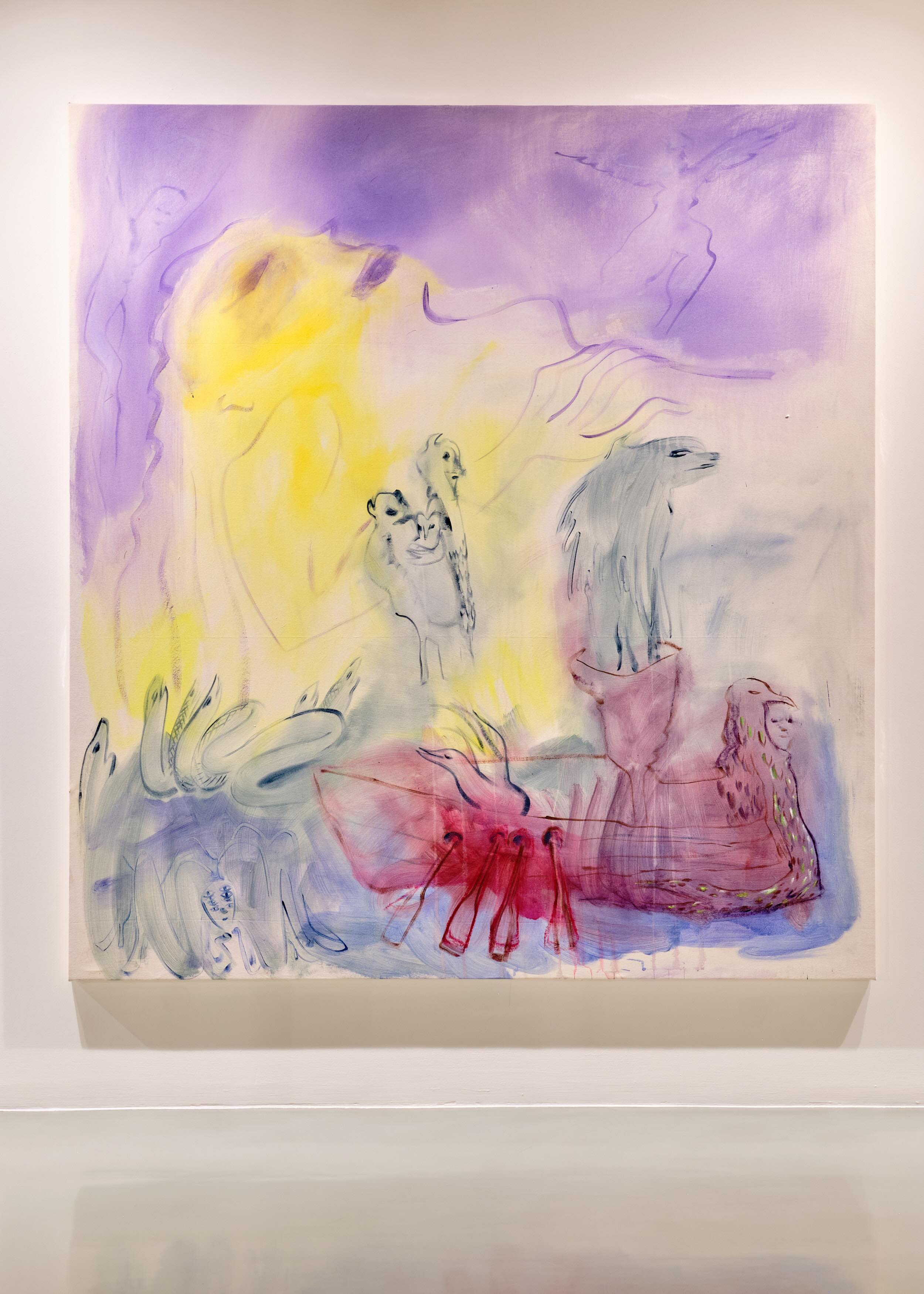 Las pinturas aparecieron al final. En un gesto circular, Culprit trasladó las condiciones de su periodo nómada a lienzos de gran formato, de dos metros por lado en promedio. Abrazando el clima de la ciudad, los sacó a la lluvia y reconoció que el acrílico se comportaba como las acuarelas de pequeño formato que había realizado un año antes. En lapsos breves, pintaba gestos automáticos y dejaba salir whatever was there en un salto de fe, antes de que el color se expandiera y sangrara sobre la superficie, marcando un cambio con su trabajo pictórico previo de contornos duros y campos cromáticos definidos. Los gestos se informan por iconografía cicládica, mitología griega, simbología del tarot Minchiate, las Venus paleolíticas, pero también por la memoria de encuentros sexuales, funcionando como umbrales narrativos: estados posteriores, cruces y residuos de experiencia.