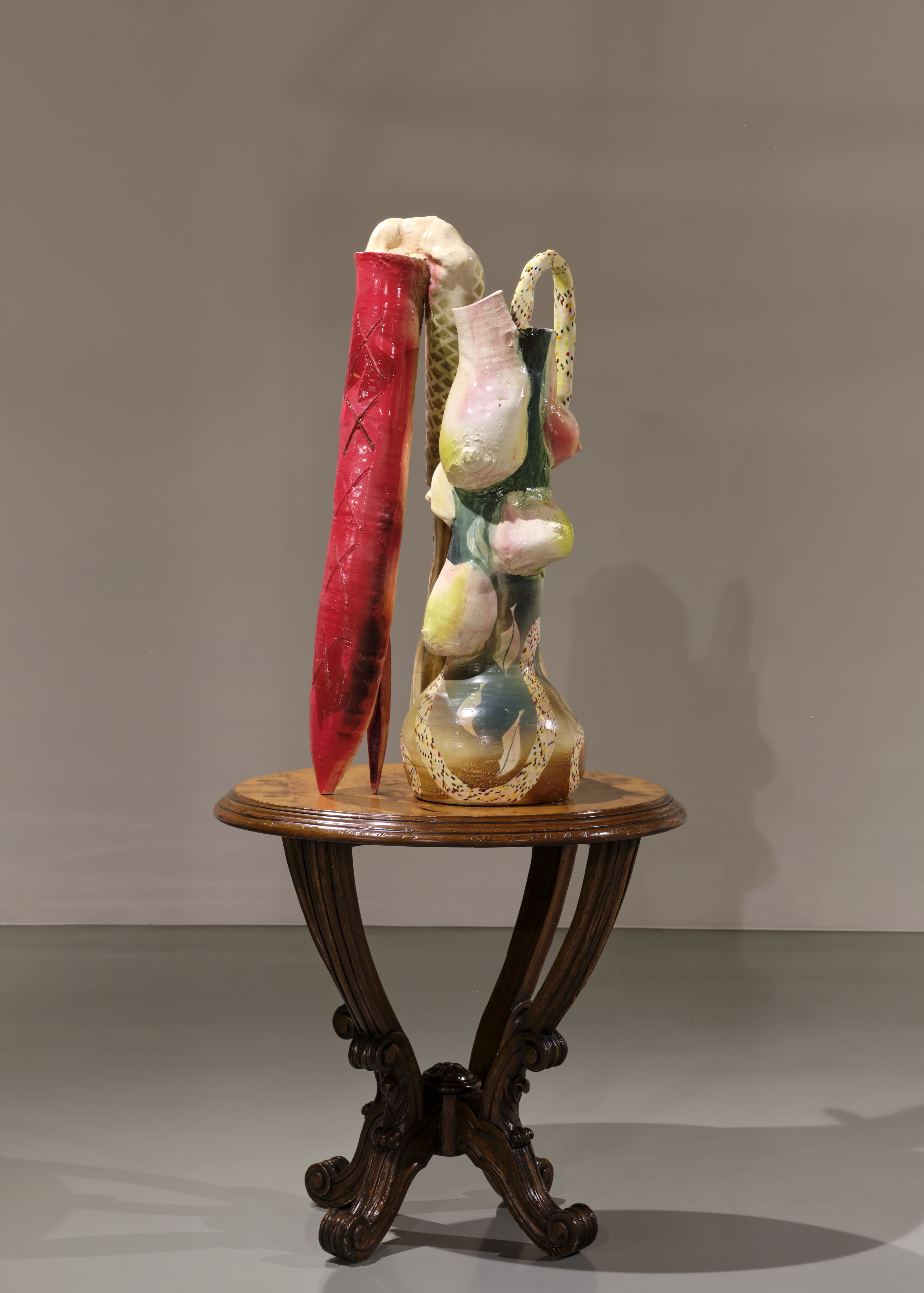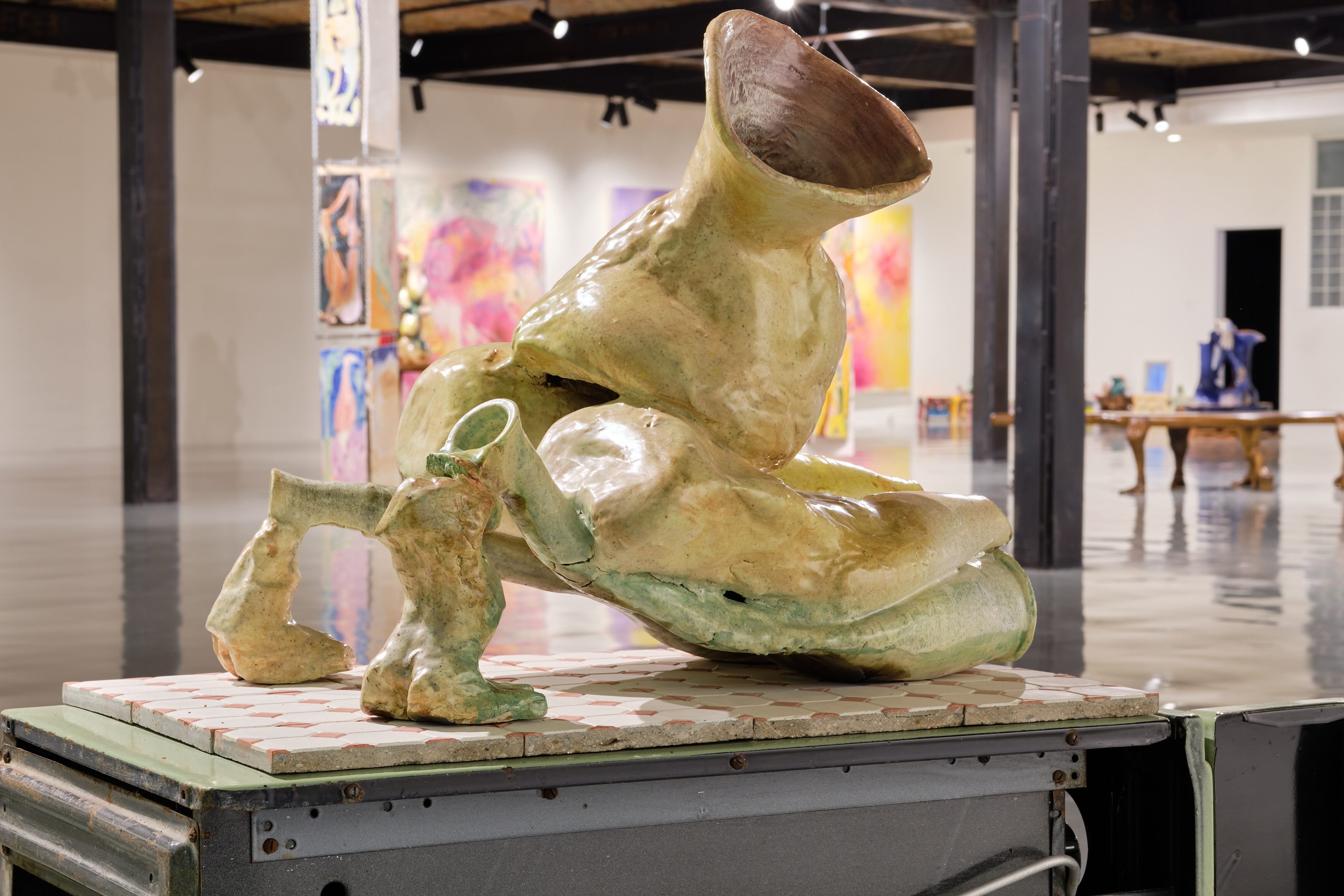 Entre la serie, la obra Diosa Doméstica (Swamp Queen) Refusal/Petrified Prokaryotes (2025) muestra una figura descompuesta, adoptando una postura hincada, pero no sumisa, como la de un depredador al acecho o un animal rezando. Su forma recuerda que bajo el dualismo cartesiano mente/cuerpo, las brujas fueron consideradas bestiales y puramente corporales, al igual que los animales, pues sus prácticas escapaban a la “mente”, a la disciplina social y económica que emergía con la transición al capitalismo. Como esta, las demás vasijas se desbordan y se vierten sobre sí mismas, con pies y manos articulando la relación del cuerpo femenino con los objetos domésticos. En particular, a la mujer como guardiana de la espiritualidad del hogar, la moral y el orden emocional; una labor que antes de la cacería de brujas, no estaba separada de la vida ni vaciada de autoridad, y que después, no fue reconocida como empleo remunerado, sino como función naturalizada.