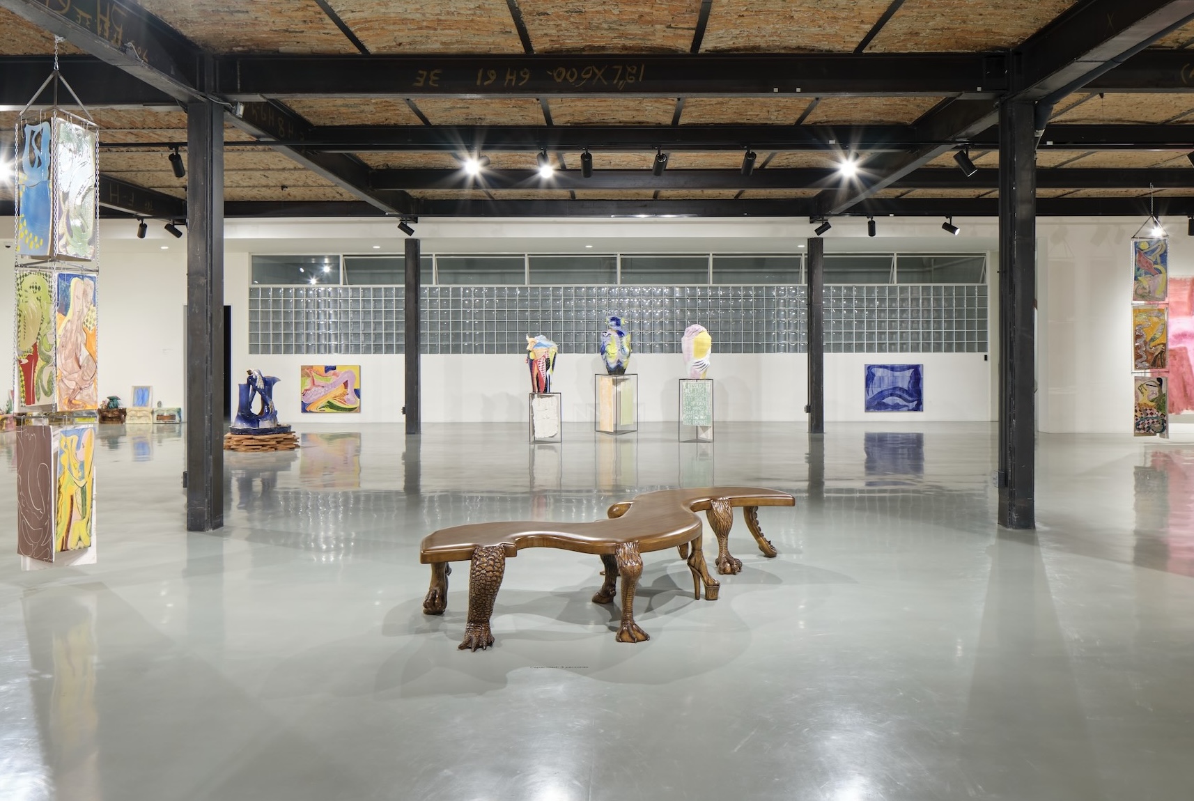 Rodeada por los campos de color de los cuadros, la banca Cuerpo Colectivo (Ancestral Evolution) (2025) fue concebida apuntando a dos experiencias sensoriales precisas: inducir la presencia profunda, cercana a la que revela los misterios en una iglesia, y generar un espacio de conversación que conecta cuerpos humanos y animales.