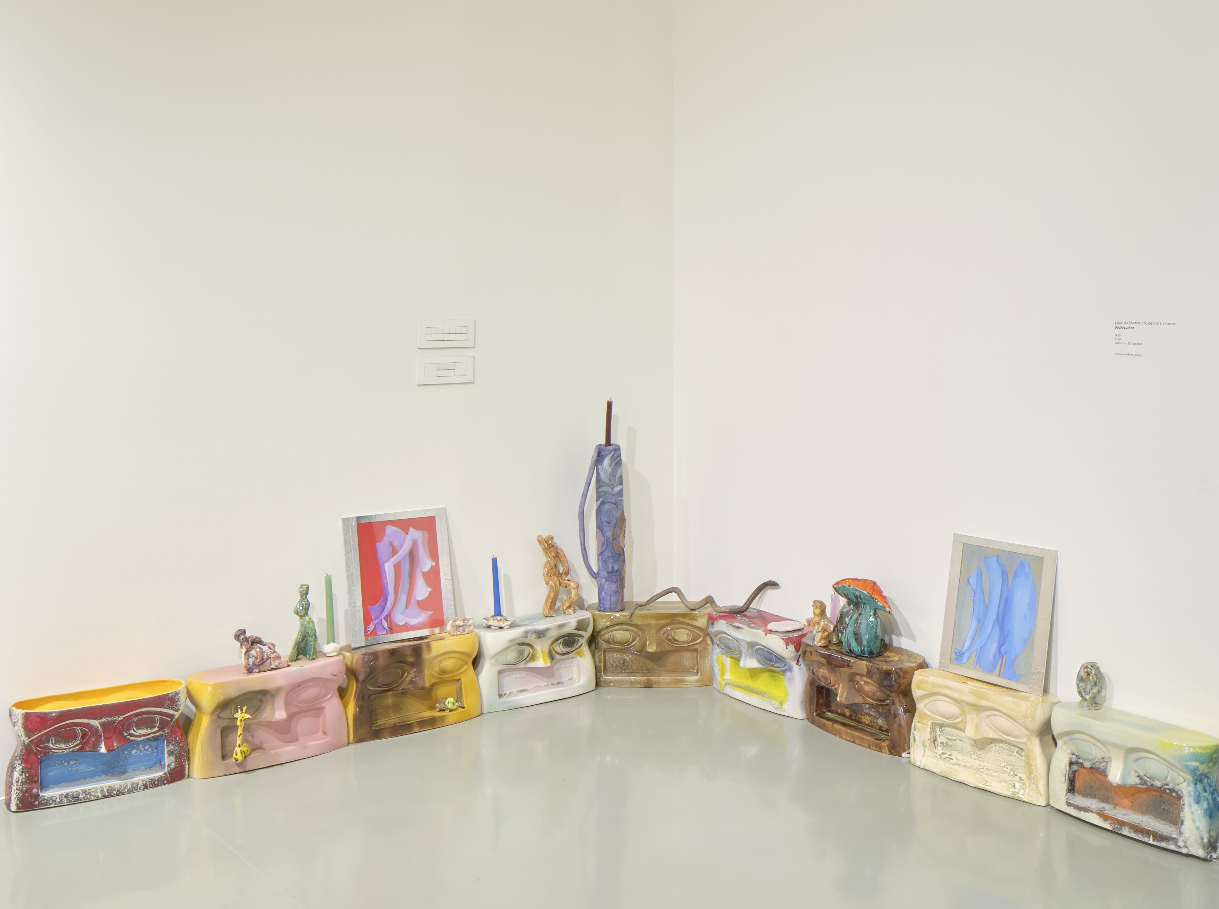 El montaje final tomó otro rumbo. La sala de Plataforma se presenta elegante y cuidadosamente ordenada. Se introdujeron el vacío y el silencio, se redujo la cantidad de obra y se eliminó la saturación mediante una distribución perimetral de las esculturas, con aire que domina entre las pinturas. Al centro descansa una banca como objeto autónomo. Cinco tótems escultóricos formados por nueve tablillas articuladas en forma triangular, Columna Flotante I-V (2025), replican rítmicamente la arquitectura de la sala. Los Jarrones Guardianes (2025) –(Diosa),(Toro) y (Manos)– ya no custodian la entrada, ahora esperan al fondo, en un corredor que conduce hacia un espacio que evoca un altar con Padre, Hijo y Espíritu Santo.